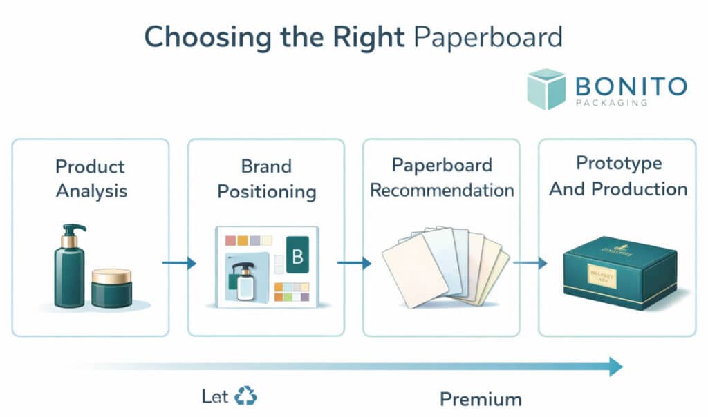 When we design custom boxes, folding carton boxes, corrugated boxes, rigid boxes, and display boxes at Bonito Packaging, paperboard selection is one of the first expert decisions we lock in with you. [bonito-packaging]
