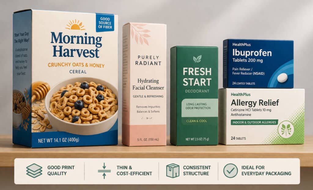 – Cost‑sensitive folding carton boxes for dry groceries, household products, and some personal care.