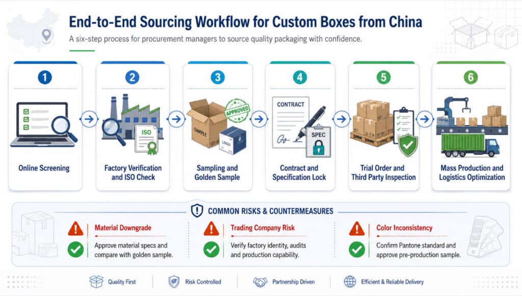 Include full technical specs (paper type, grammage, flute, coating, insert material) in the contract and golden sample documentation. Run periodic third‑party tests (compression, grammage checks) on incoming shipments and perform at least one unannounced on‑site audit during high‑volume periods. [chinasourcinggroup]
