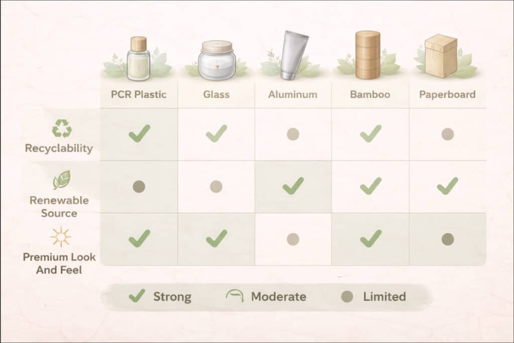 Start by mapping your product types (liquids, powders, solids) and required barrier performance, then short-list materials like PCR plastics, glass, aluminum, and high-PCR paper that can meet those needs. Next, consider your region’s recycling infrastructure and regulations so you avoid materials that are theoretically sustainable but hard to process locally. Finally, work with your packaging manufacturer to test prototypes with actual users to balance sustainability, cost, and user experience. [apackaginggroup]