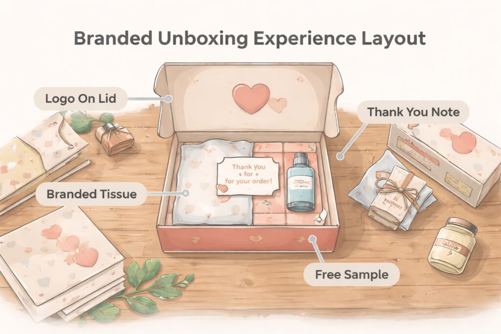 Start with custom tape or stickers and simple interior tissue, plus a short thank‑you note. These changes are inexpensive, easy to implement, and instantly make your shipments feel more thoughtful and branded. [pakfactory]