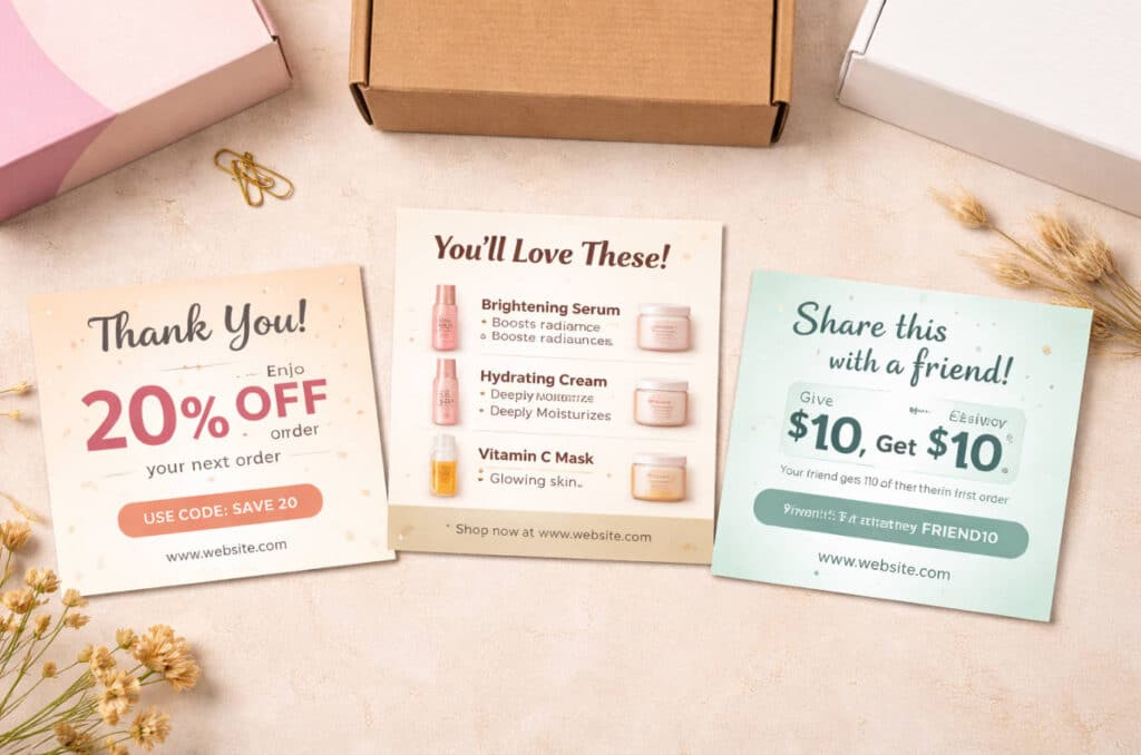 You can, but you’ll get better results by tailoring at least some elements—copy, visuals, or format—to product category or box style. For example, a generic thank-you card can be reused, while product suggestion cards and samples are more effective when aligned with the specific order. [tycoonpackaging]