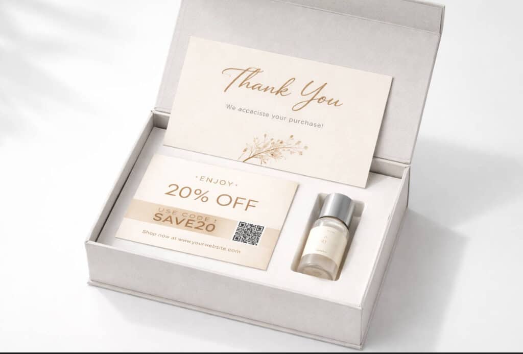 Discount cards are a classic box insert for a reason—they’re easy to track and directly tied to repeat purchase behavior. [uprinting]