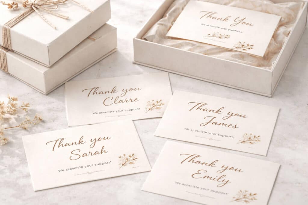 Handwritten or highly personalized thank-you notes are still one of the most memorable insert types, especially for small to mid-size brands. They signal that there is a real person behind the logo. [smartpress]